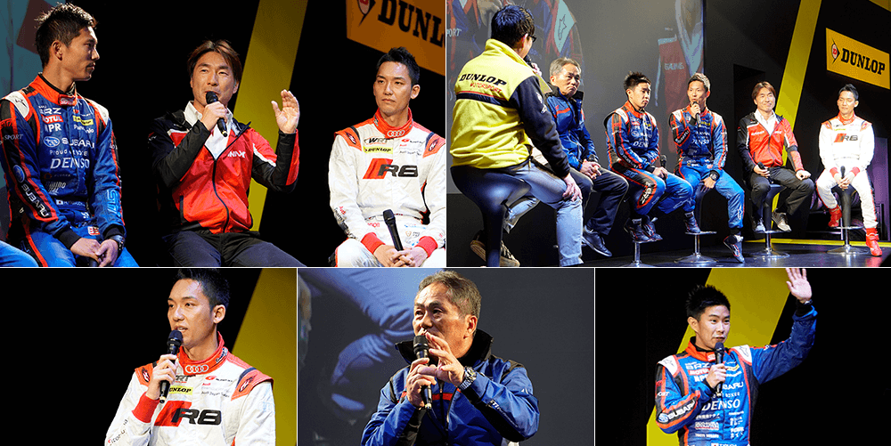 まずは「DUNLOP Super GT300トークショー」。ゲストはSUBARUチーム総監督でSTIモータースポーツ プロジェクト室 室長の辰己英治さん、ドライバーの山内英輝選手と井口卓人選手、GAINERを率いてGT-RとAMG GT-3を走らせる田中哲也総監督、Audi Team HitotsuyamaでR8 LMSを駆るドライバーの藤井誠暢選手です。