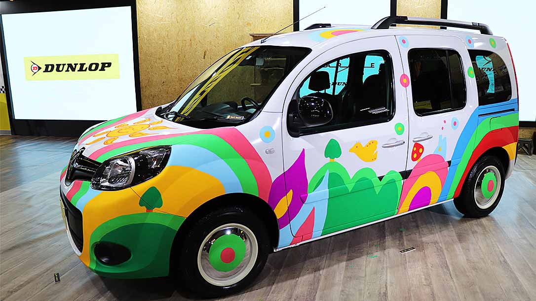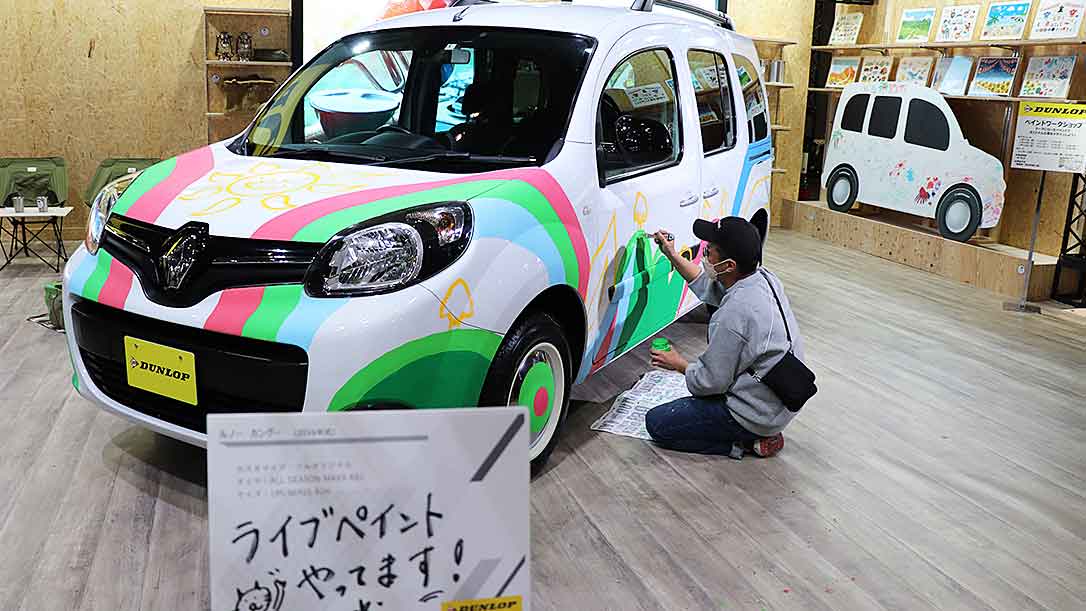 アウトドアゾーンでは、キャンプに行く家族をイメージしたガレージを作りました。 展示車両は、ルノー カングー。会期中、ライブペイントを行い、お子様にも人気の華やかな車両に仕上げました。