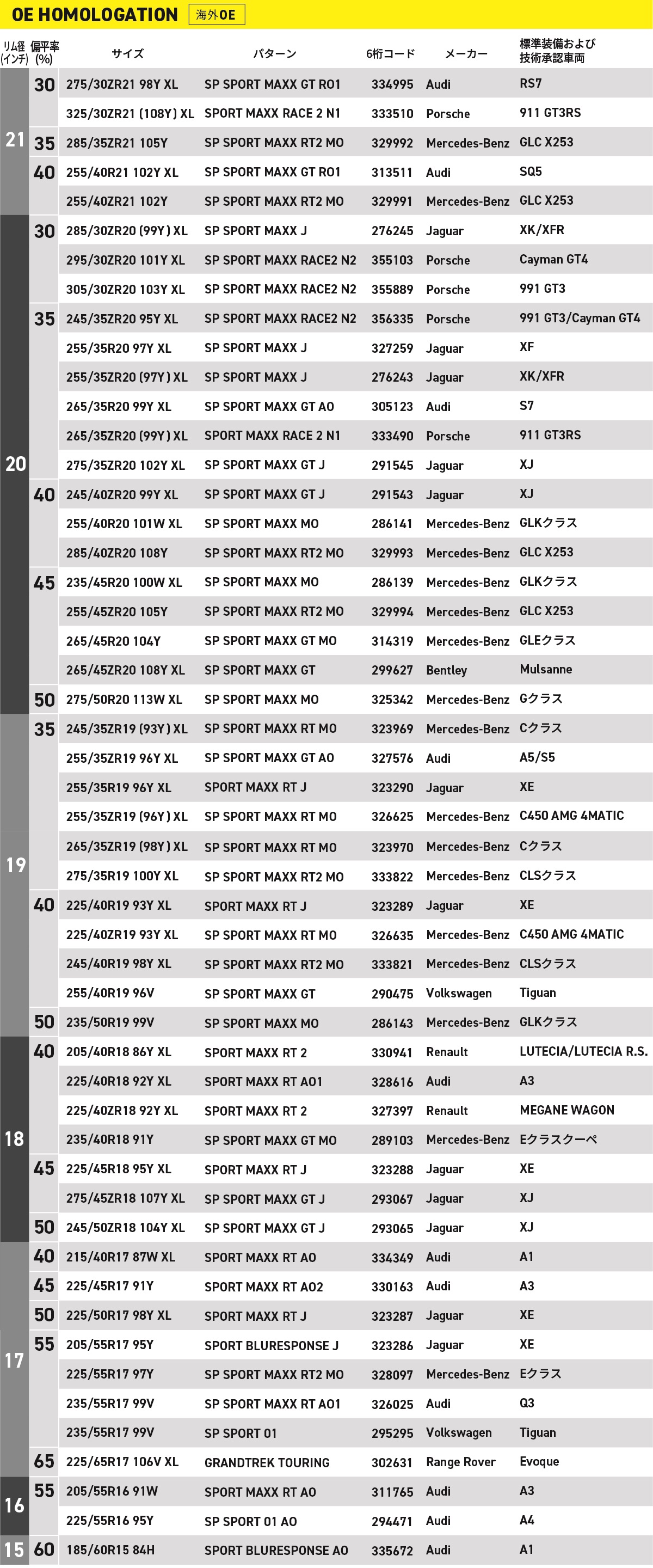 XL=EXTRA LOAD 規格(負荷能力強化タイプ)です。 MO=メルセデスベンツの承認を表す記号です。 RO1、AO=Audi の承認を表す記号です。 N1、N2=Porsche の承認を表す記号です。