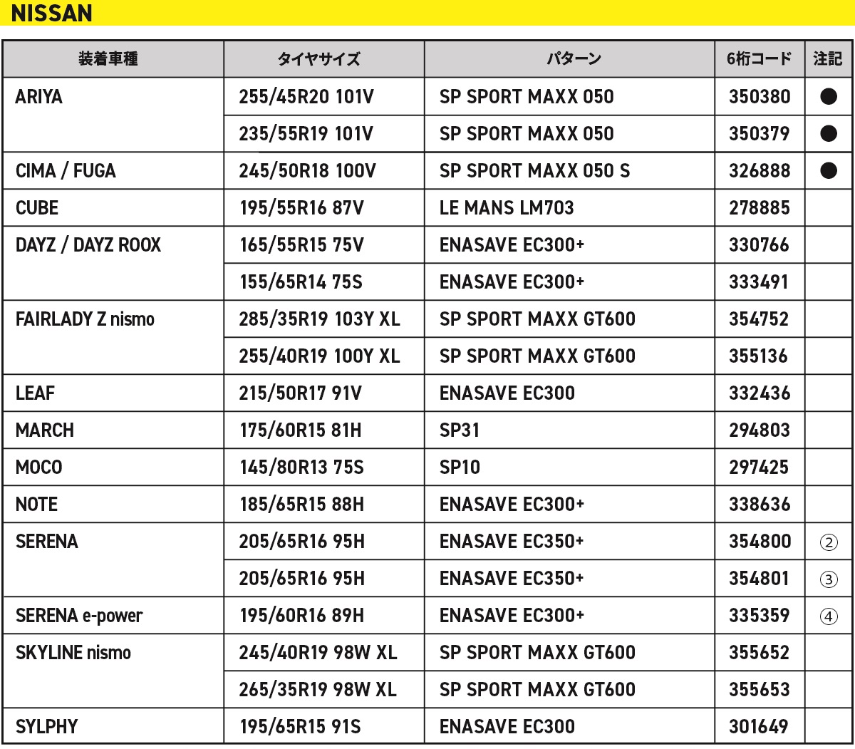 ②=ガソリン車のXグレード向けです。 ③=Xグレード以外の車両向けです。 ④=e-POWER HIGHWAY STAR G 向けです。 ●=サイレントコア搭載タイヤです。